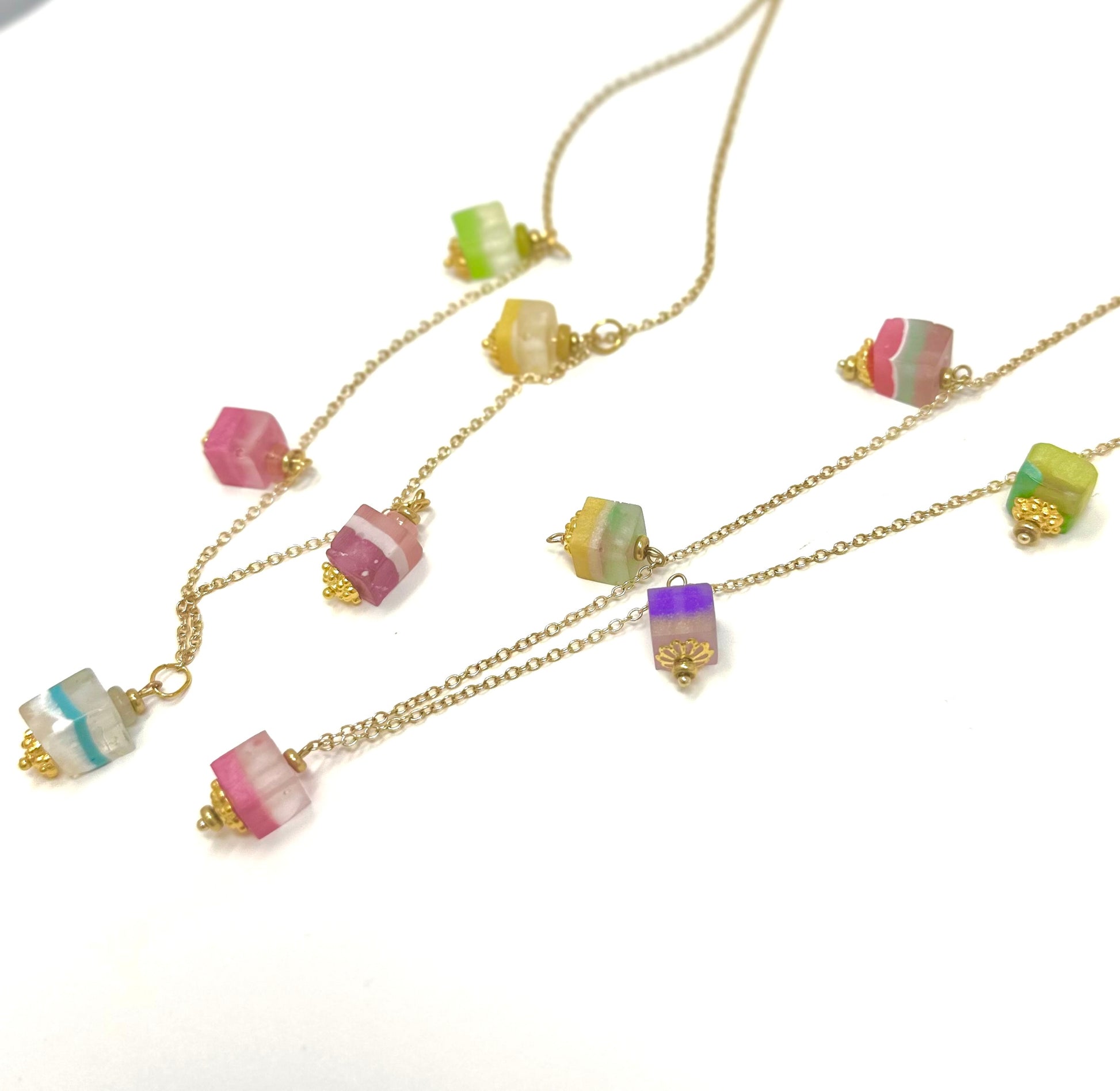 Introducing the Candy Chain Necklace from Africalis youthful minimal collection, a delicate cascade of translucent pastel resin beads in soft candy-inspired layering of pink; yellow, green, blue or purple. The beads suspended on a fine 14-karat-gold filled chain mimic the crystalline clarity and inner glow of Quartz crystals nestled within billion-old rocks that are part of the South African landscape. Handcrafted, each bead is hand poured and necklaces features unique colors in pastel shades No two necklaces are alike.