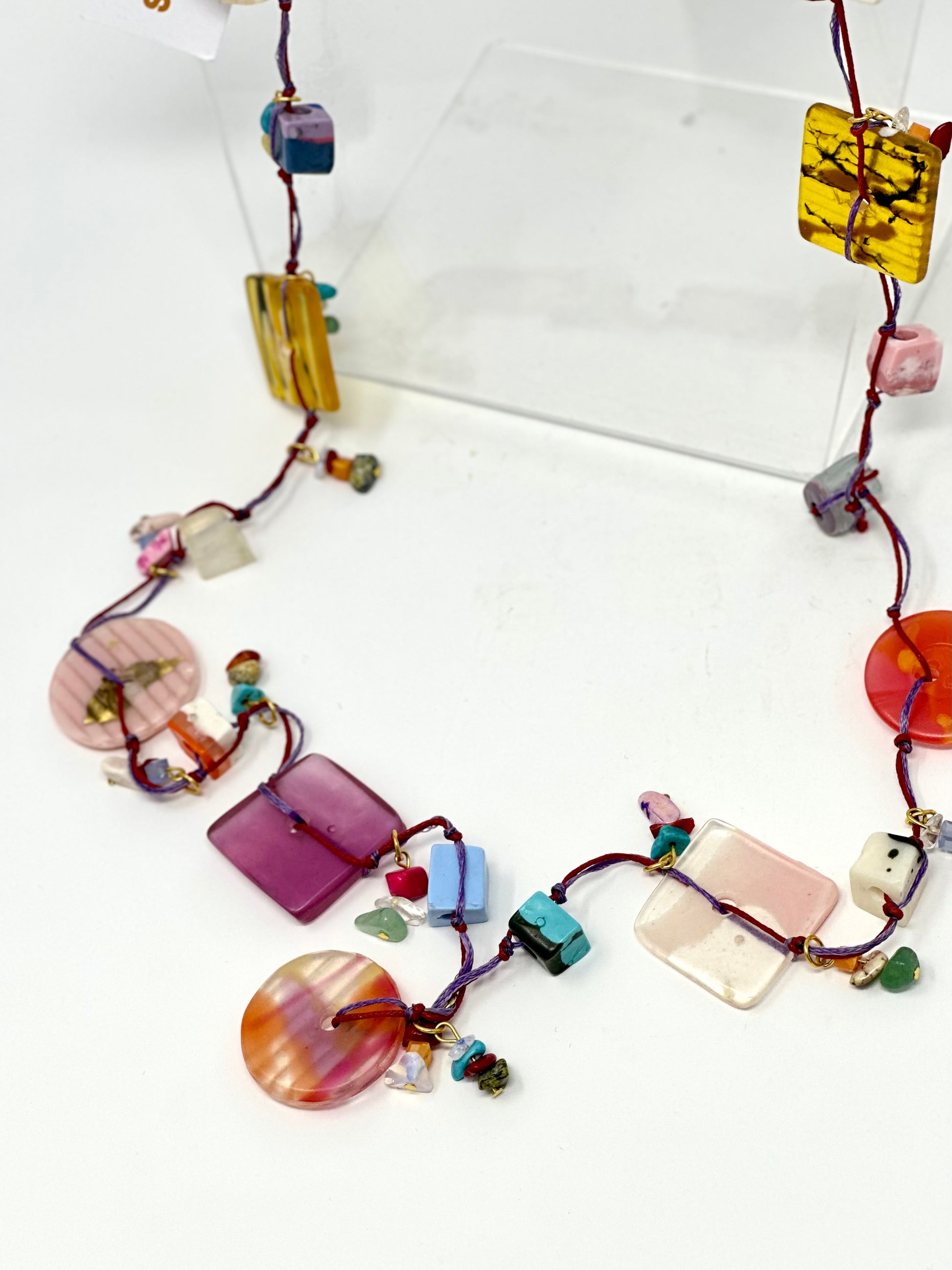 Inspired by the myriad colors that range from orchids to wildflowers in South Africa, the multicolor string necklace features translucent resin beads, hued and veined with contrasting colors.