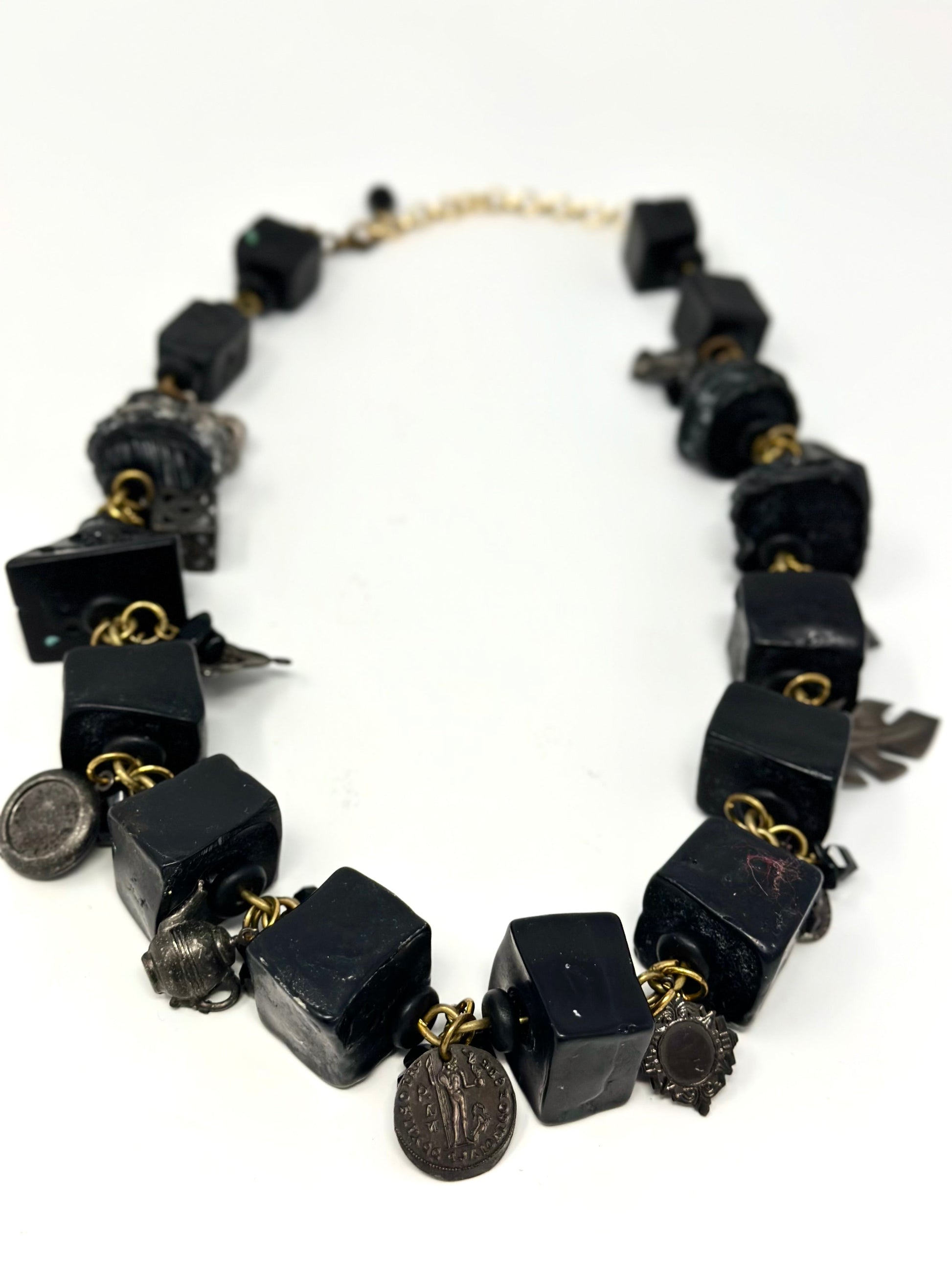 Black Resin Bead Necklace embellished with metallic charms and semi-precious stones. The resin beads recreate, in a lightweight form, volcanic lava solidified to Basalt.